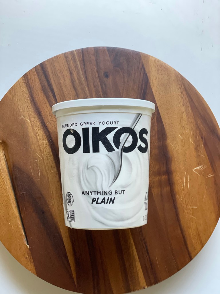 Blended Greek Yogurt Oikos – THIS IS ANYTHING BUT PLAIN! I mean that. The flavor is perfect to eat just on its own, but feel free to add granola or fruit. Since it is mango season, my go-to fruit is mangos, so I have been placing them in my Oikos plain yogurt. IT IS SO GOOD!